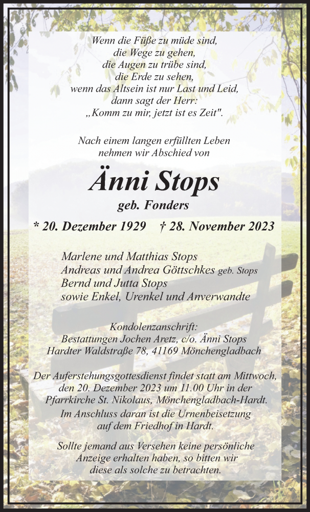 Hier finden Sie alle Traueranzeigen aus der Zeitung, die bisher für Änni Stops erschienen sind. Weitere Traueranzeigen, die in der Zeitung erscheinen, werden hier ebenfalls aufgelistet
