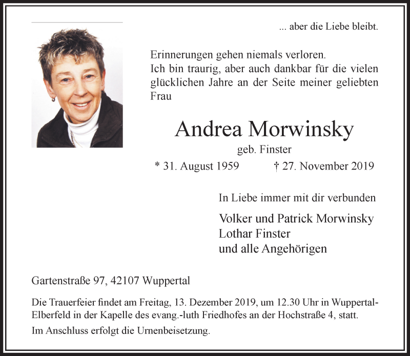 Hier finden Sie alle Traueranzeigen aus der Zeitung, die bisher für Andrea Morwinsky erschienen sind. Weitere Traueranzeigen, die in der Zeitung erscheinen, werden hier ebenfalls aufgelistet