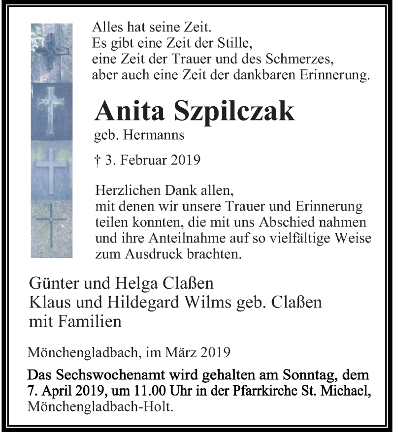 Hier finden Sie alle Traueranzeigen aus der Zeitung, die bisher für Anita Szpilczak erschienen sind. Weitere Traueranzeigen, die in der Zeitung erscheinen, werden hier ebenfalls aufgelistet
