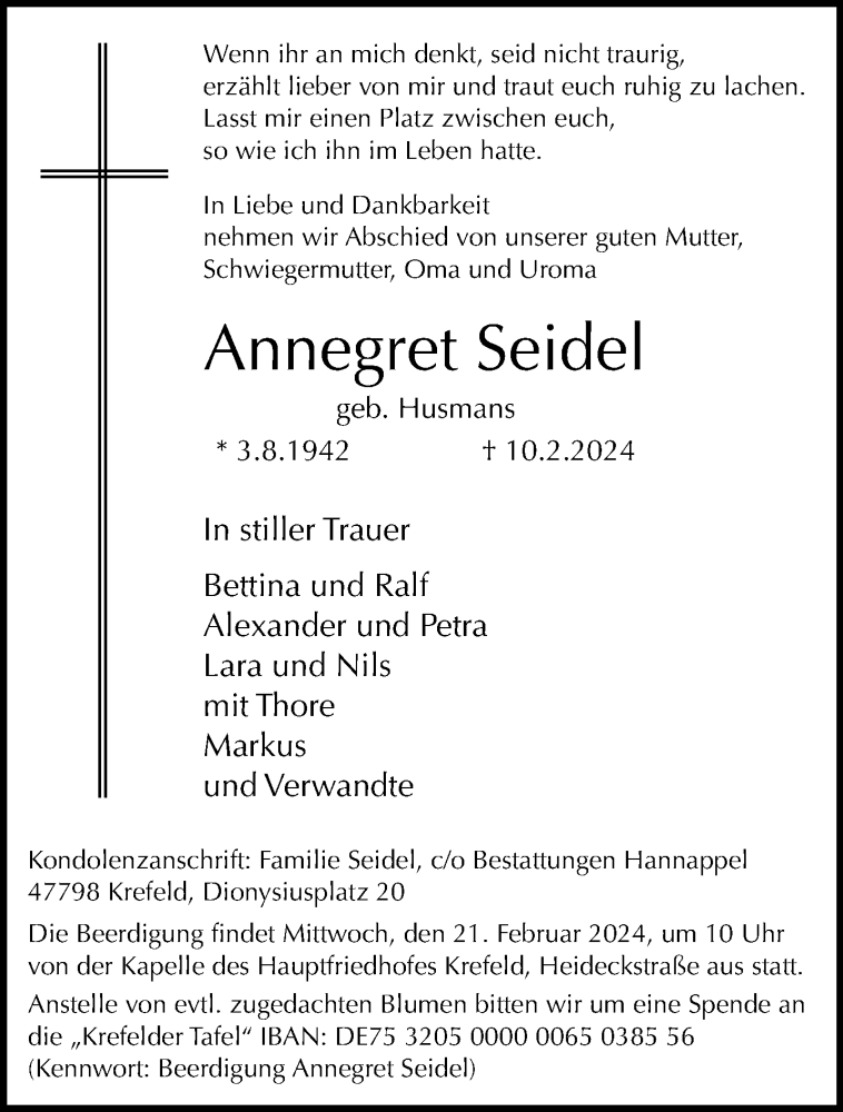 Hier finden Sie alle Traueranzeigen aus der Zeitung, die bisher für Annegret Seidel erschienen sind. Weitere Traueranzeigen, die in der Zeitung erscheinen, werden hier ebenfalls aufgelistet