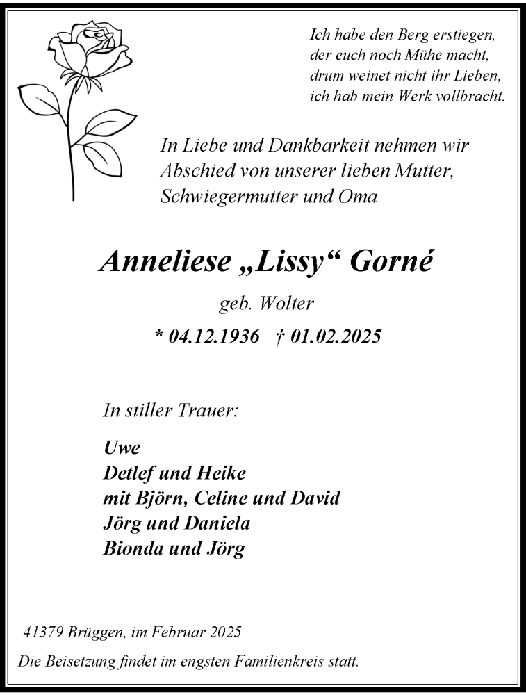 Hier finden Sie alle Traueranzeigen aus der Zeitung, die bisher für Anneliese Gorne erschienen sind. Weitere Traueranzeigen, die in der Zeitung erscheinen, werden hier ebenfalls aufgelistet