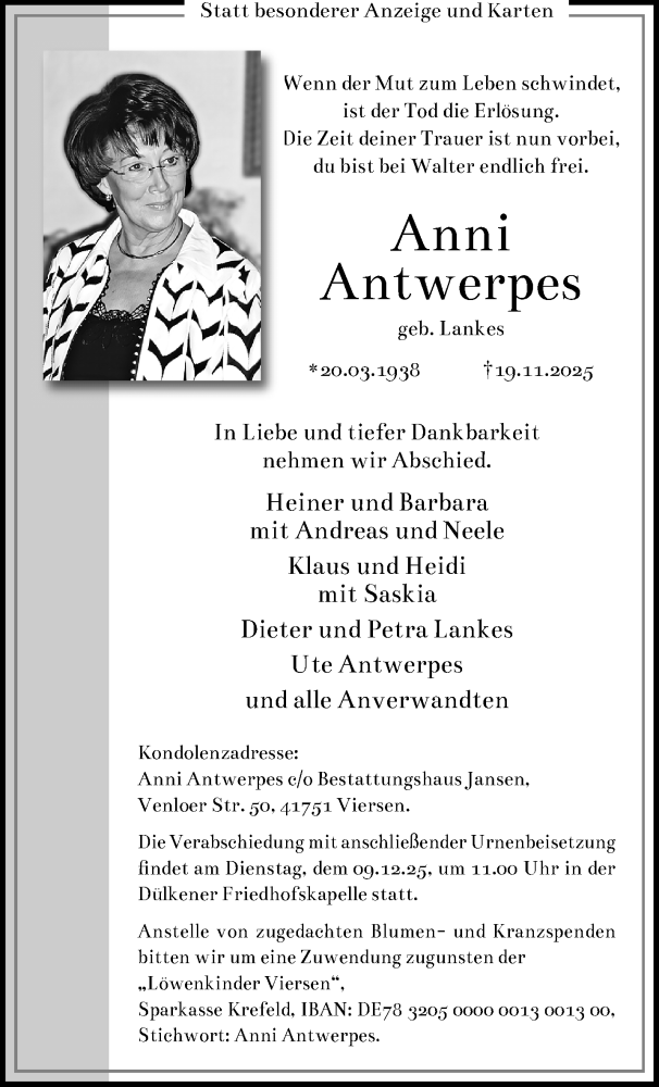 Hier finden Sie alle Traueranzeigen aus der Zeitung, die bisher für Anni Antwerpes erschienen sind. Weitere Traueranzeigen, die in der Zeitung erscheinen, werden hier ebenfalls aufgelistet