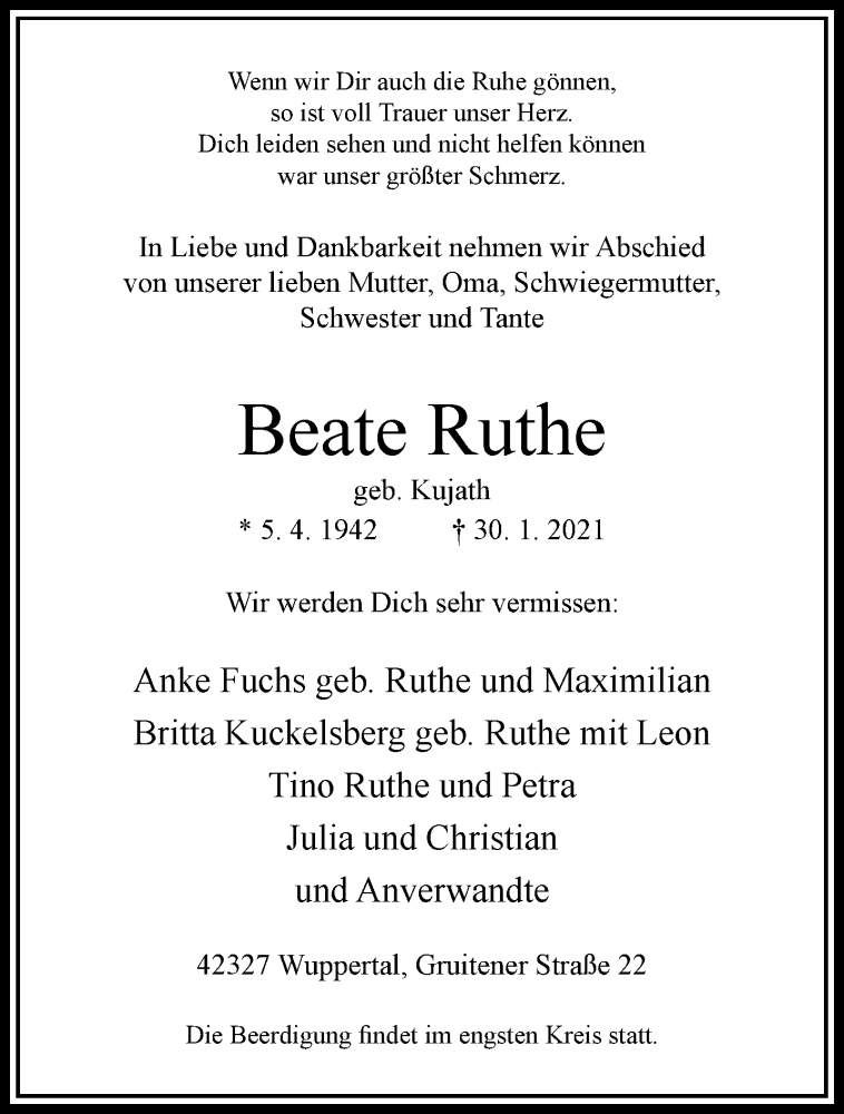 Hier finden Sie alle Traueranzeigen aus der Zeitung, die bisher für Beate Ruthe erschienen sind. Weitere Traueranzeigen, die in der Zeitung erscheinen, werden hier ebenfalls aufgelistet