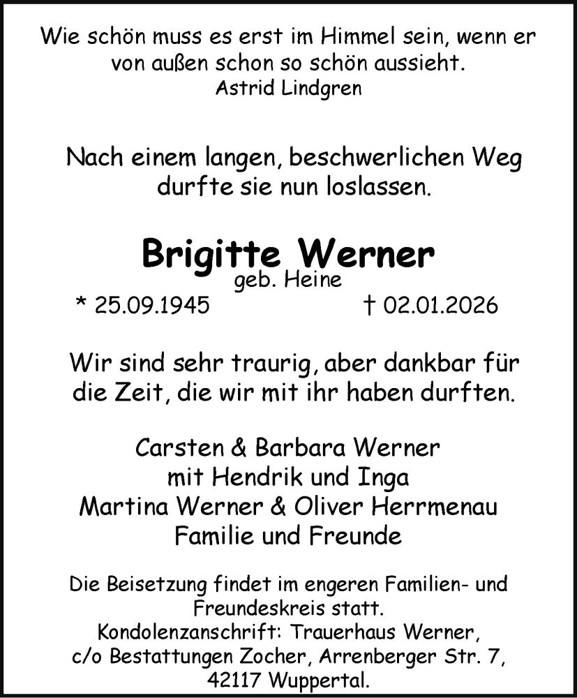 Hier finden Sie alle Traueranzeigen aus der Zeitung, die bisher für Brigitte Werner erschienen sind. Weitere Traueranzeigen, die in der Zeitung erscheinen, werden hier ebenfalls aufgelistet