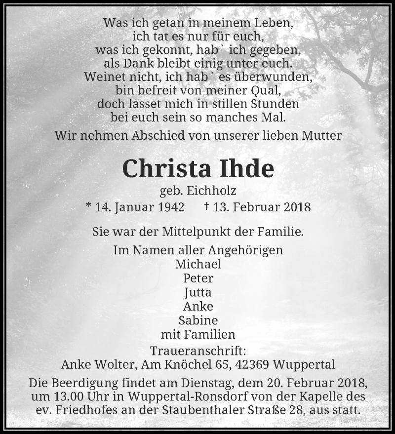 Hier finden Sie alle Traueranzeigen aus der Zeitung, die bisher für Christa Ihde erschienen sind. Weitere Traueranzeigen, die in der Zeitung erscheinen, werden hier ebenfalls aufgelistet