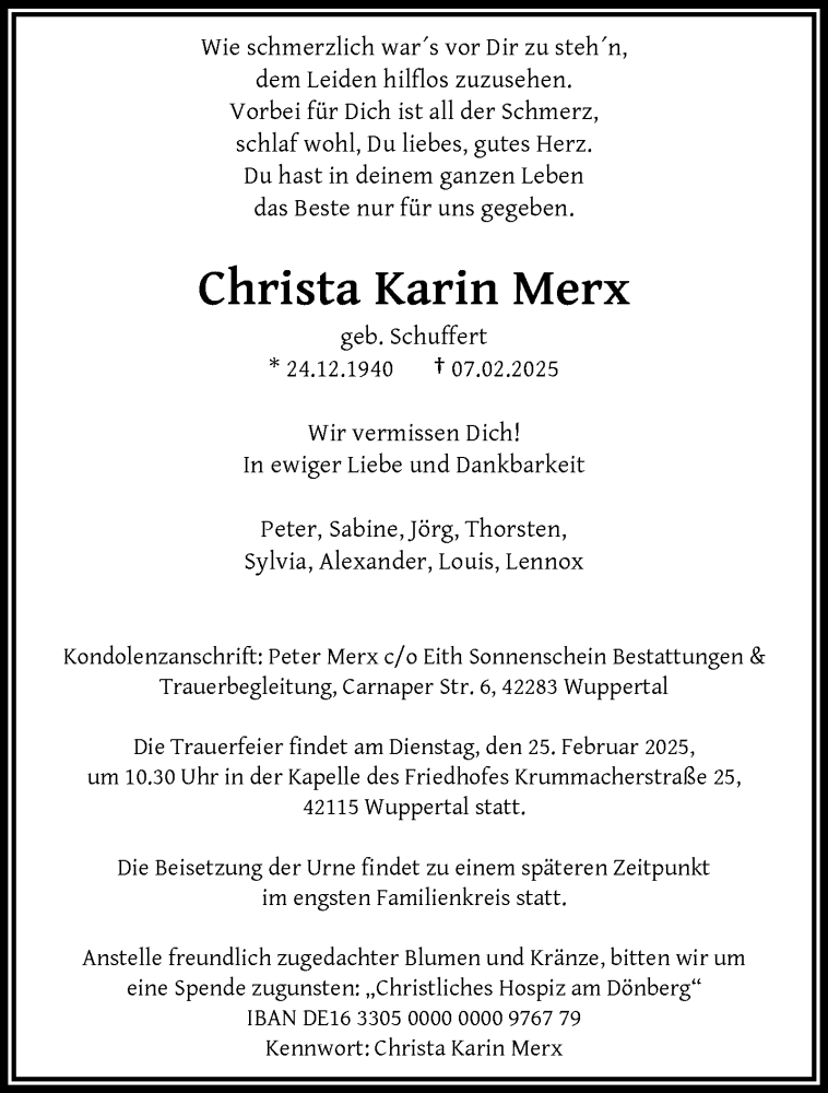 Hier finden Sie alle Traueranzeigen aus der Zeitung, die bisher für Christa Karin Merx erschienen sind. Weitere Traueranzeigen, die in der Zeitung erscheinen, werden hier ebenfalls aufgelistet