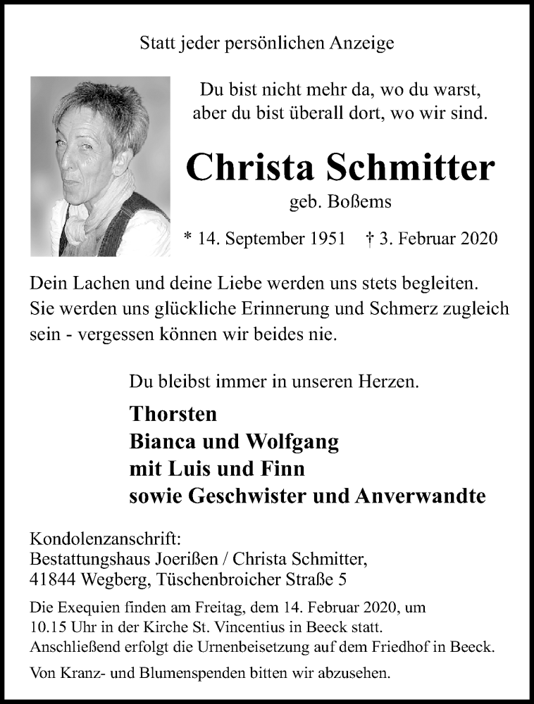 Hier finden Sie alle Traueranzeigen aus der Zeitung, die bisher für Christa Schmitter erschienen sind. Weitere Traueranzeigen, die in der Zeitung erscheinen, werden hier ebenfalls aufgelistet