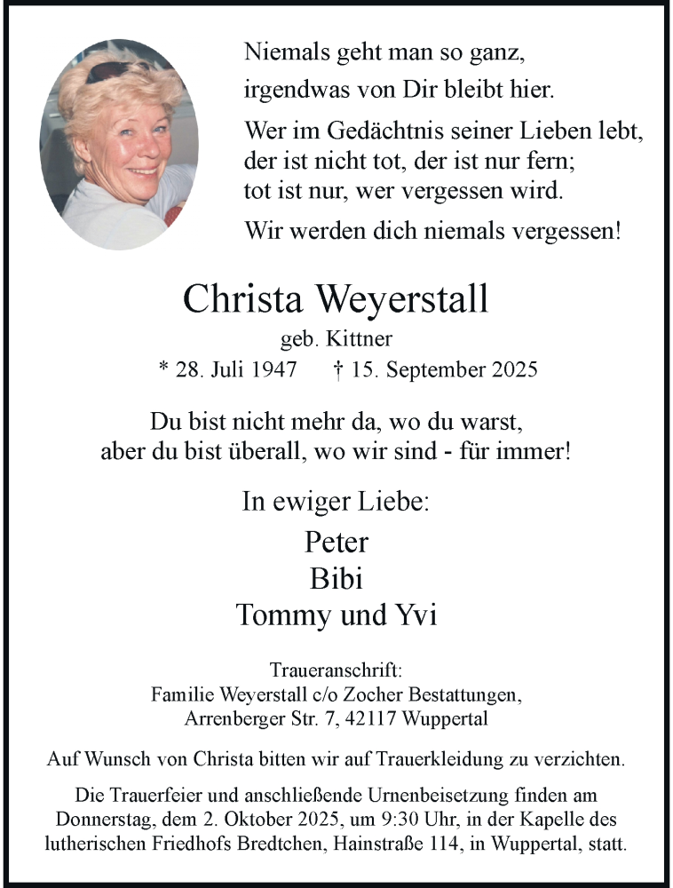 Hier finden Sie alle Traueranzeigen aus der Zeitung, die bisher für Christa Weyerstall erschienen sind. Weitere Traueranzeigen, die in der Zeitung erscheinen, werden hier ebenfalls aufgelistet
