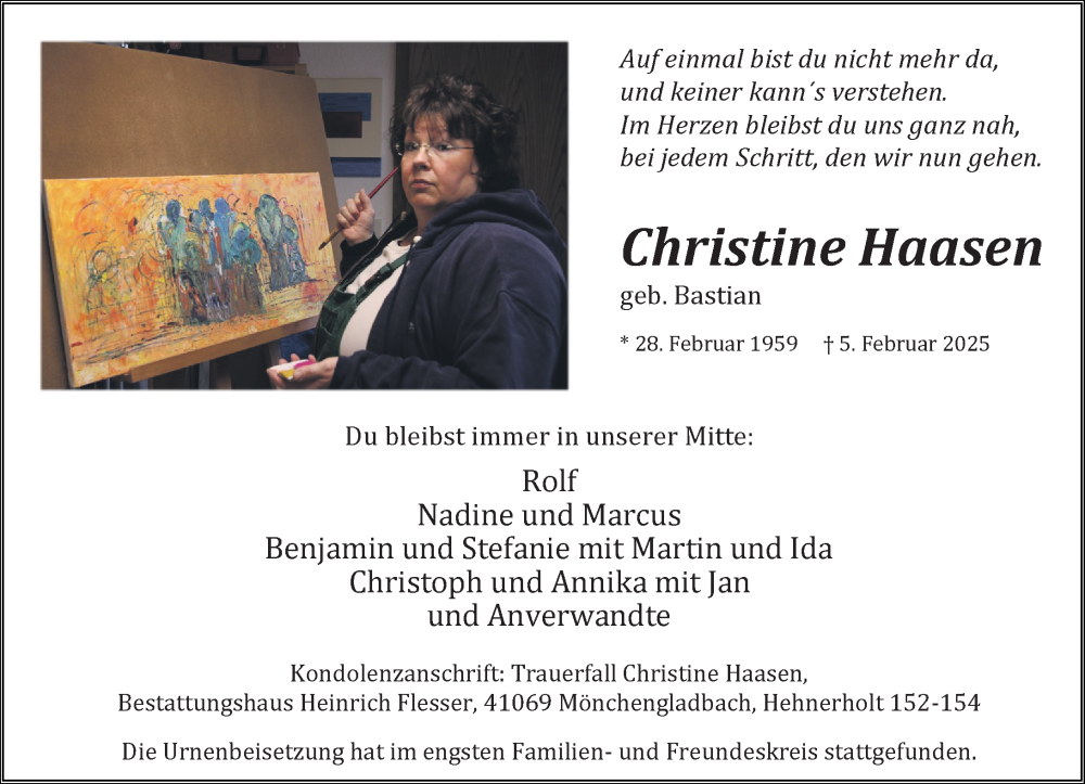 Hier finden Sie alle Traueranzeigen aus der Zeitung, die bisher für Christine Haasen erschienen sind. Weitere Traueranzeigen, die in der Zeitung erscheinen, werden hier ebenfalls aufgelistet