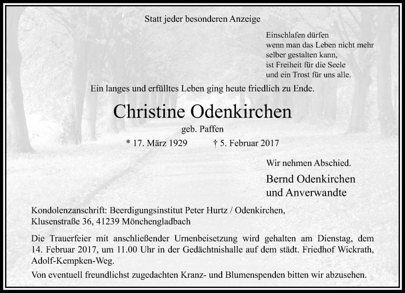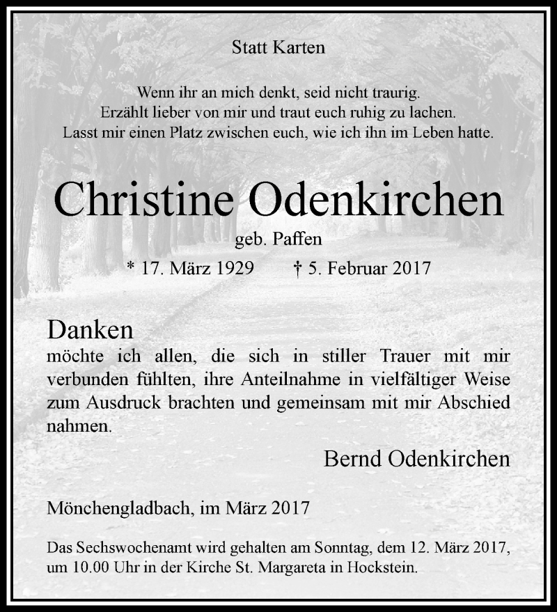 Hier finden Sie alle Traueranzeigen aus der Zeitung, die bisher für Christine Odenkirchen erschienen sind. Weitere Traueranzeigen, die in der Zeitung erscheinen, werden hier ebenfalls aufgelistet