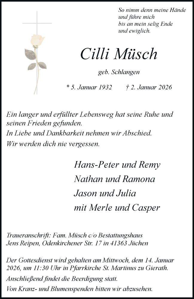 Hier finden Sie alle Traueranzeigen aus der Zeitung, die bisher für Cilli Müsch erschienen sind. Weitere Traueranzeigen, die in der Zeitung erscheinen, werden hier ebenfalls aufgelistet