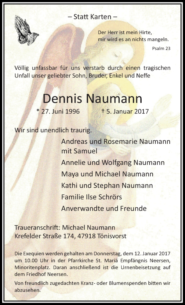 Hier finden Sie alle Traueranzeigen aus der Zeitung, die bisher für Dennis Naumann erschienen sind. Weitere Traueranzeigen, die in der Zeitung erscheinen, werden hier ebenfalls aufgelistet