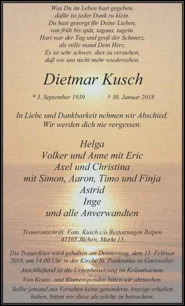 Hier finden Sie alle Traueranzeigen aus der Zeitung, die bisher für Dietmar Kusch erschienen sind. Weitere Traueranzeigen, die in der Zeitung erscheinen, werden hier ebenfalls aufgelistet