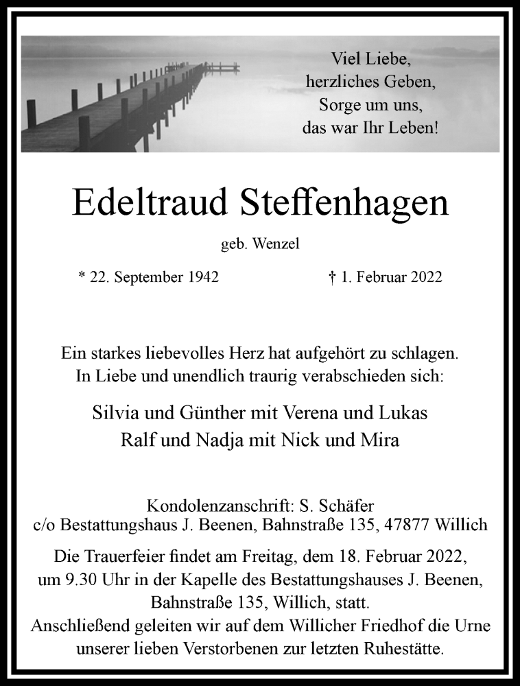 Hier finden Sie alle Traueranzeigen aus der Zeitung, die bisher für Edeltraud Steffenhagen erschienen sind. Weitere Traueranzeigen, die in der Zeitung erscheinen, werden hier ebenfalls aufgelistet