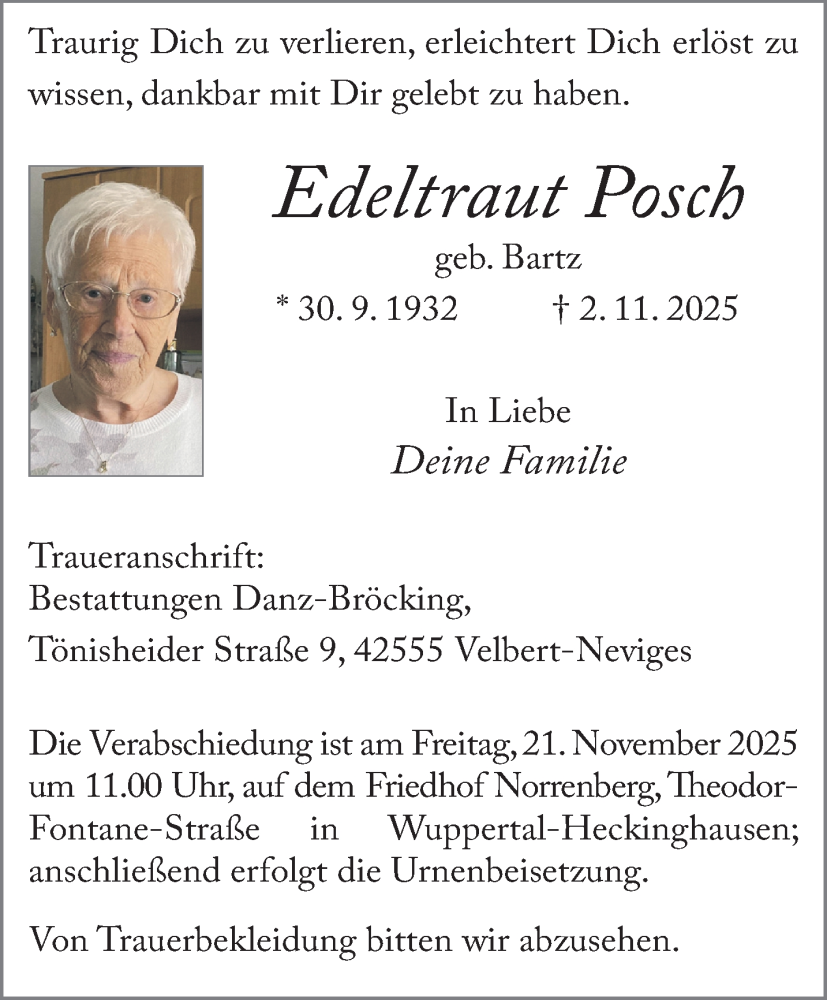 Hier finden Sie alle Traueranzeigen aus der Zeitung, die bisher für Edeltraut Posch erschienen sind. Weitere Traueranzeigen, die in der Zeitung erscheinen, werden hier ebenfalls aufgelistet