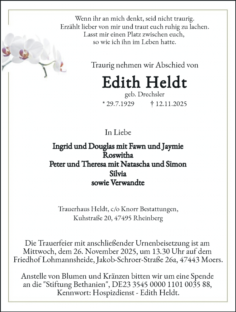 Hier finden Sie alle Traueranzeigen aus der Zeitung, die bisher für Edith Heldt erschienen sind. Weitere Traueranzeigen, die in der Zeitung erscheinen, werden hier ebenfalls aufgelistet