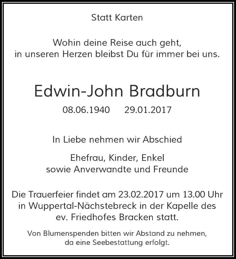 Hier finden Sie alle Traueranzeigen aus der Zeitung, die bisher für Edwin-John Bradburn erschienen sind. Weitere Traueranzeigen, die in der Zeitung erscheinen, werden hier ebenfalls aufgelistet