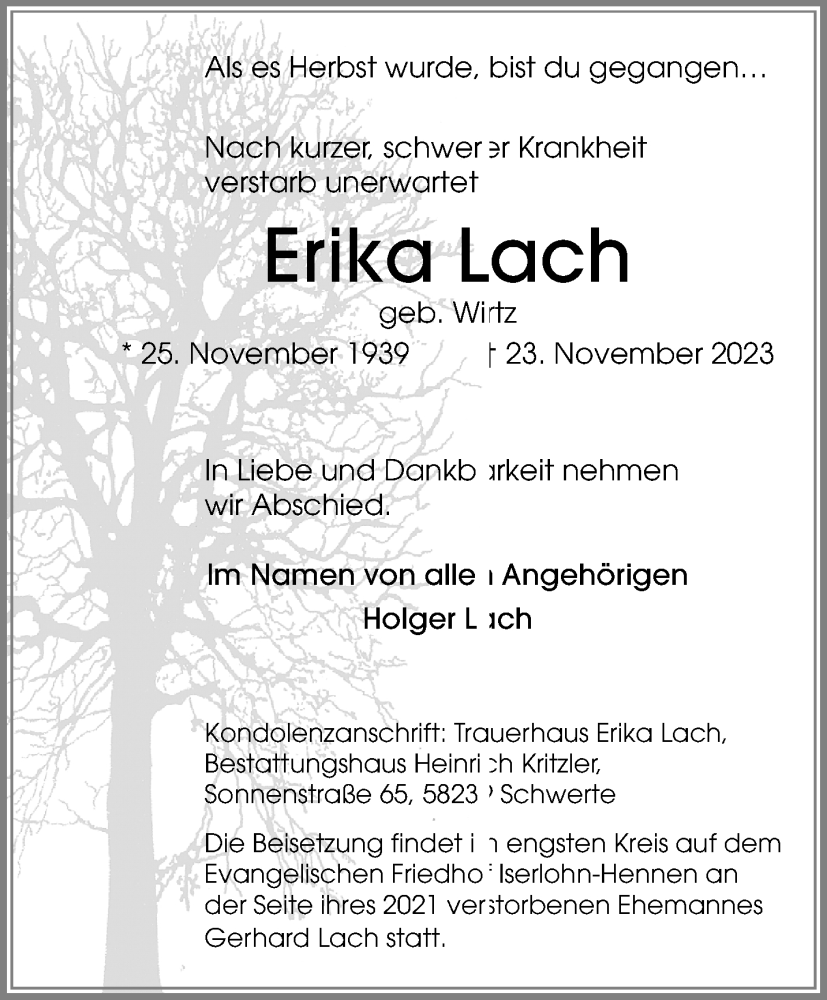 Hier finden Sie alle Traueranzeigen aus der Zeitung, die bisher für Erika Lach erschienen sind. Weitere Traueranzeigen, die in der Zeitung erscheinen, werden hier ebenfalls aufgelistet