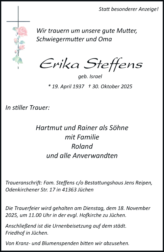 Hier finden Sie alle Traueranzeigen aus der Zeitung, die bisher für Erika Steffens erschienen sind. Weitere Traueranzeigen, die in der Zeitung erscheinen, werden hier ebenfalls aufgelistet