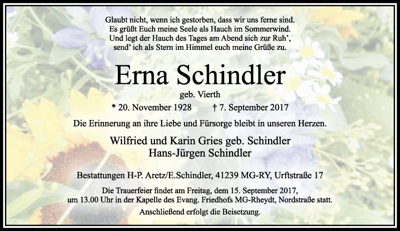 Hier finden Sie alle Traueranzeigen aus der Zeitung, die bisher für Erna Schindler erschienen sind. Weitere Traueranzeigen, die in der Zeitung erscheinen, werden hier ebenfalls aufgelistet