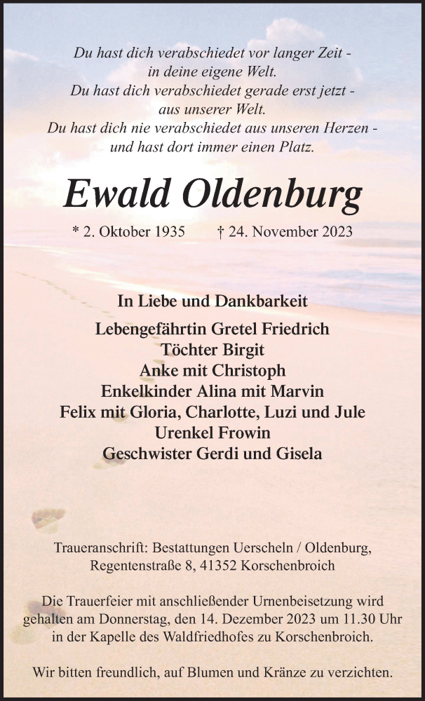 Hier finden Sie alle Traueranzeigen aus der Zeitung, die bisher für Ewald Oldenburg erschienen sind. Weitere Traueranzeigen, die in der Zeitung erscheinen, werden hier ebenfalls aufgelistet