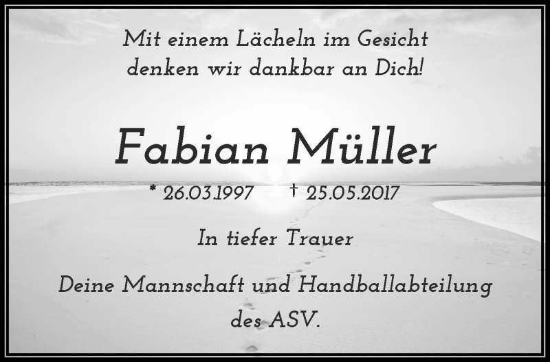 Hier finden Sie alle Traueranzeigen aus der Zeitung, die bisher für Fabian Müller erschienen sind. Weitere Traueranzeigen, die in der Zeitung erscheinen, werden hier ebenfalls aufgelistet