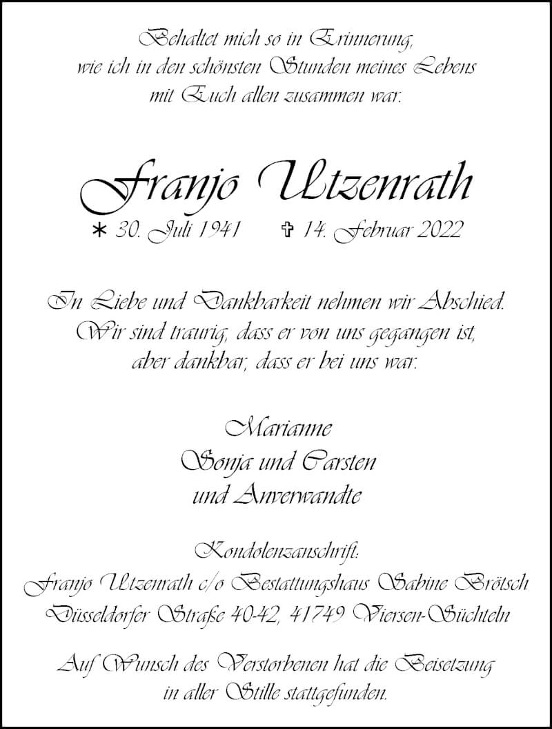Hier finden Sie alle Traueranzeigen aus der Zeitung, die bisher für Franjo Utzenrath erschienen sind. Weitere Traueranzeigen, die in der Zeitung erscheinen, werden hier ebenfalls aufgelistet