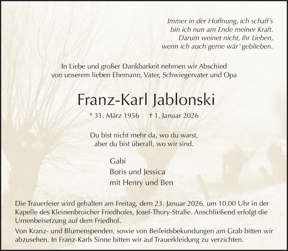 Hier finden Sie alle Traueranzeigen aus der Zeitung, die bisher für Franz-Karl Jablonski erschienen sind. Weitere Traueranzeigen, die in der Zeitung erscheinen, werden hier ebenfalls aufgelistet