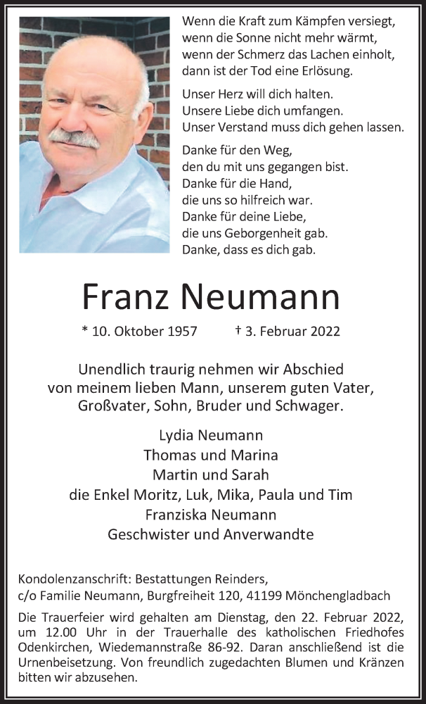Hier finden Sie alle Traueranzeigen aus der Zeitung, die bisher für Franz Neumann erschienen sind. Weitere Traueranzeigen, die in der Zeitung erscheinen, werden hier ebenfalls aufgelistet