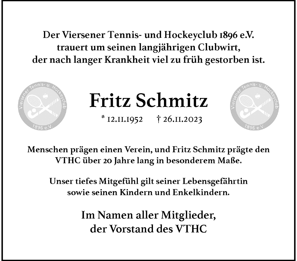 Hier finden Sie alle Traueranzeigen aus der Zeitung, die bisher für Fritz Schmitz erschienen sind. Weitere Traueranzeigen, die in der Zeitung erscheinen, werden hier ebenfalls aufgelistet
