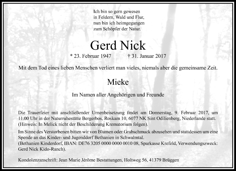 Hier finden Sie alle Traueranzeigen aus der Zeitung, die bisher für Gerd Nick erschienen sind. Weitere Traueranzeigen, die in der Zeitung erscheinen, werden hier ebenfalls aufgelistet