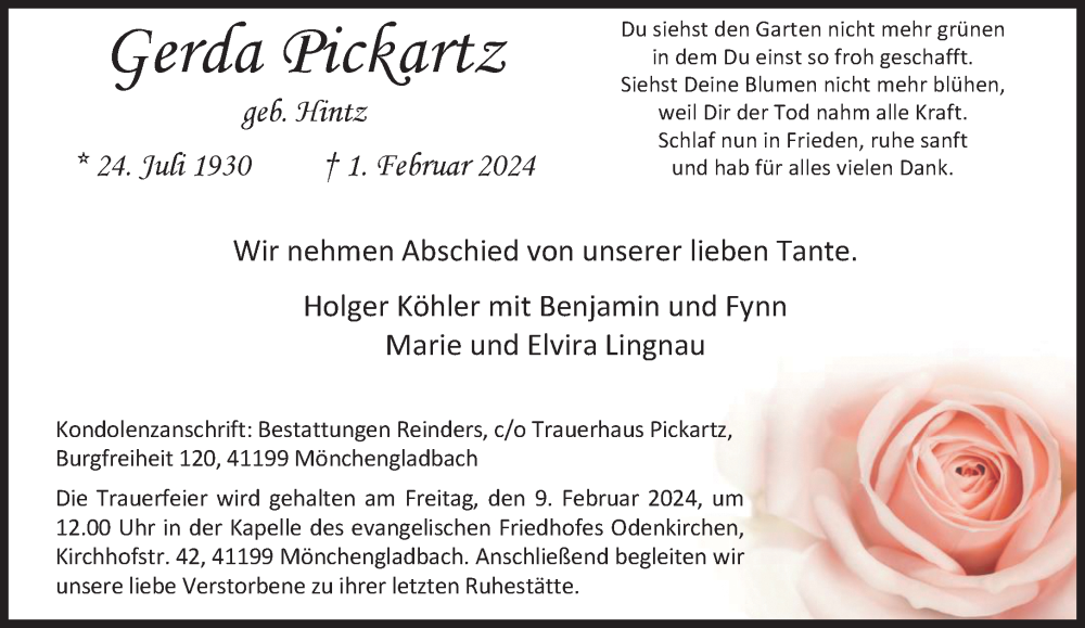 Hier finden Sie alle Traueranzeigen aus der Zeitung, die bisher für Gerda Pickartz erschienen sind. Weitere Traueranzeigen, die in der Zeitung erscheinen, werden hier ebenfalls aufgelistet