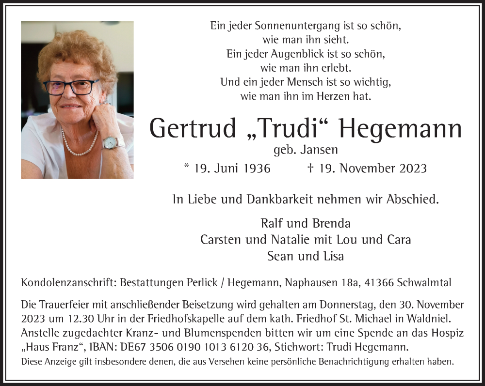 Hier finden Sie alle Traueranzeigen aus der Zeitung, die bisher für Gertrud Hegemann erschienen sind. Weitere Traueranzeigen, die in der Zeitung erscheinen, werden hier ebenfalls aufgelistet