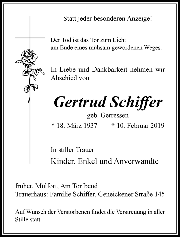 Hier finden Sie alle Traueranzeigen aus der Zeitung, die bisher für Gertrud Schiffer erschienen sind. Weitere Traueranzeigen, die in der Zeitung erscheinen, werden hier ebenfalls aufgelistet