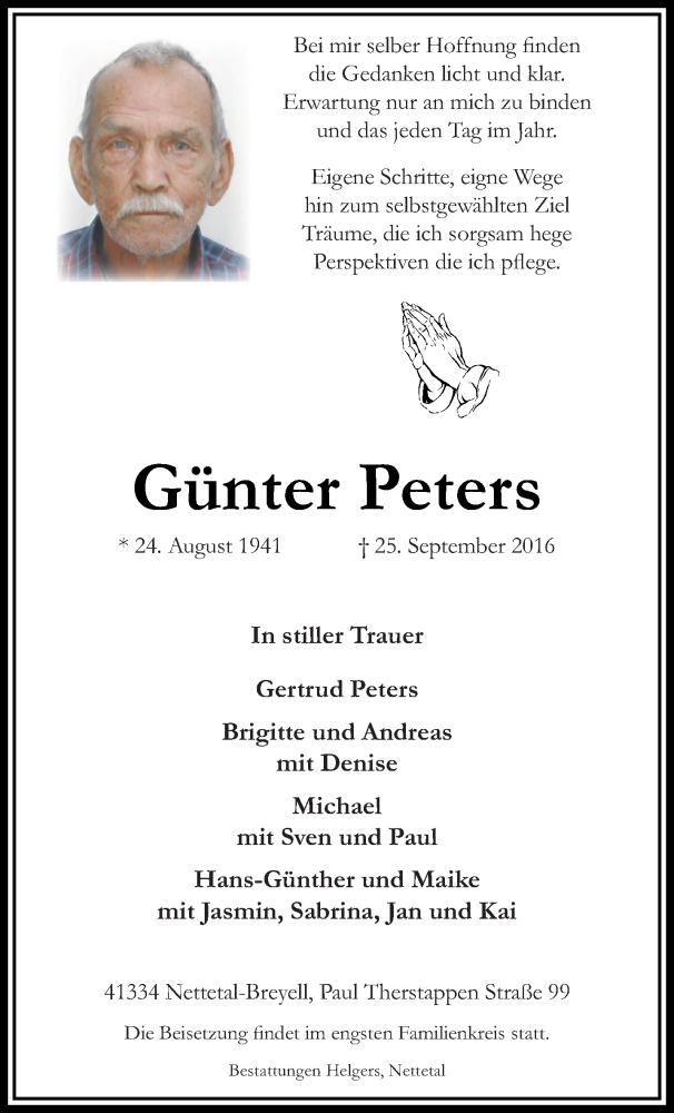 Hier finden Sie alle Traueranzeigen aus der Zeitung, die bisher für Günter Peters erschienen sind. Weitere Traueranzeigen, die in der Zeitung erscheinen, werden hier ebenfalls aufgelistet