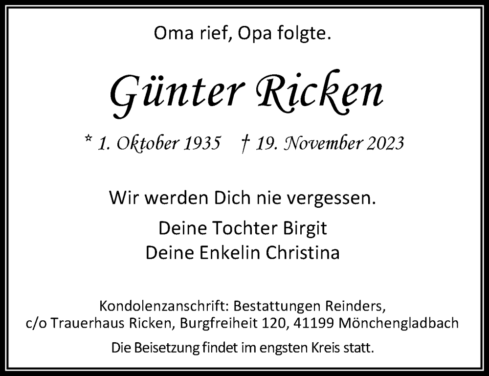 Hier finden Sie alle Traueranzeigen aus der Zeitung, die bisher für Günter Ricken erschienen sind. Weitere Traueranzeigen, die in der Zeitung erscheinen, werden hier ebenfalls aufgelistet