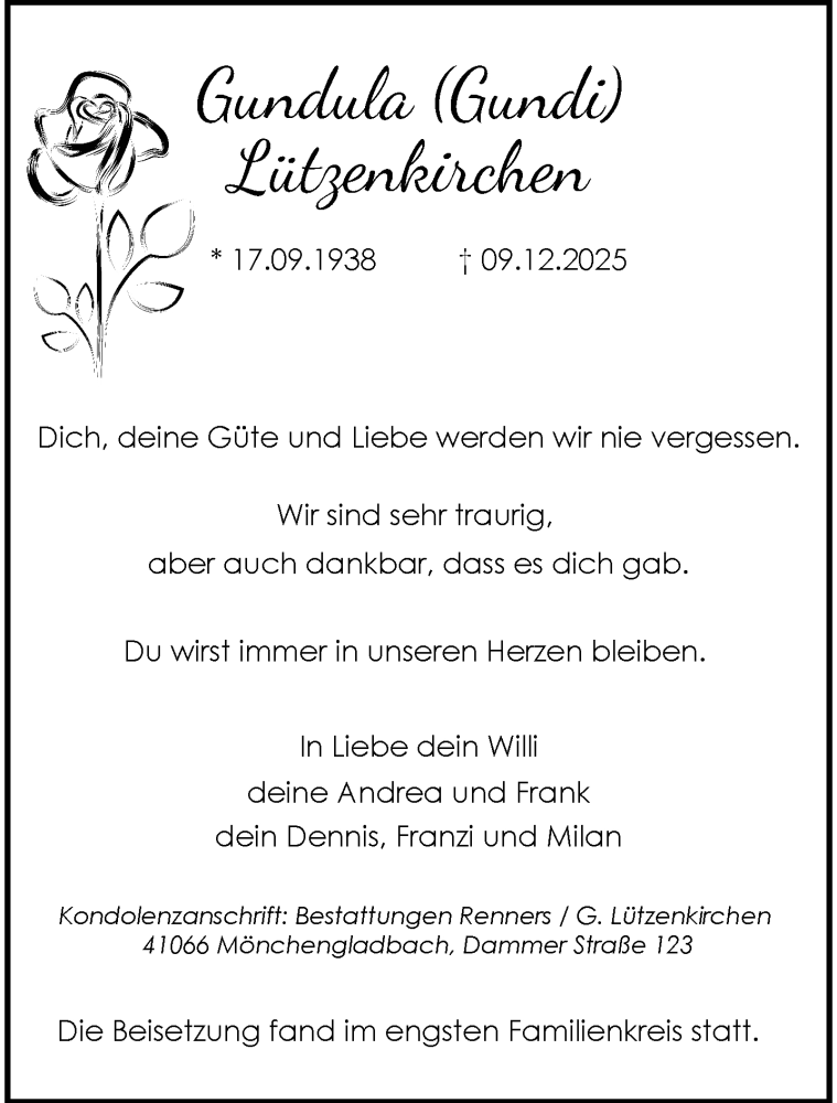Hier finden Sie alle Traueranzeigen aus der Zeitung, die bisher für Gundula Lützenkirchen erschienen sind. Weitere Traueranzeigen, die in der Zeitung erscheinen, werden hier ebenfalls aufgelistet