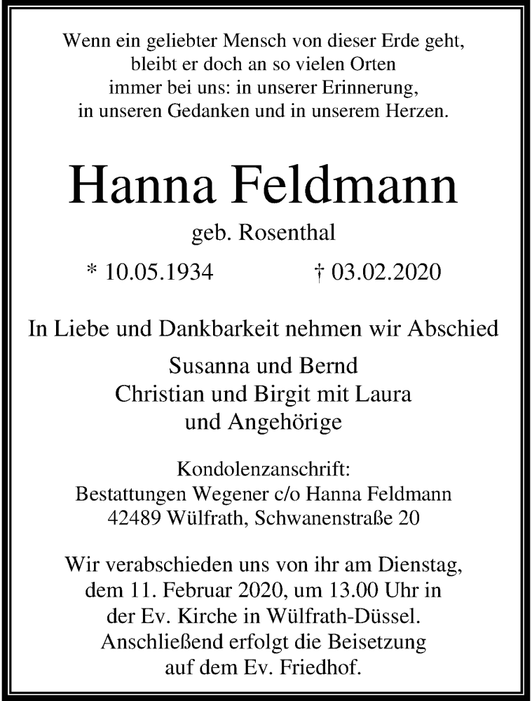 Hier finden Sie alle Traueranzeigen aus der Zeitung, die bisher für Hanna Feldmann erschienen sind. Weitere Traueranzeigen, die in der Zeitung erscheinen, werden hier ebenfalls aufgelistet