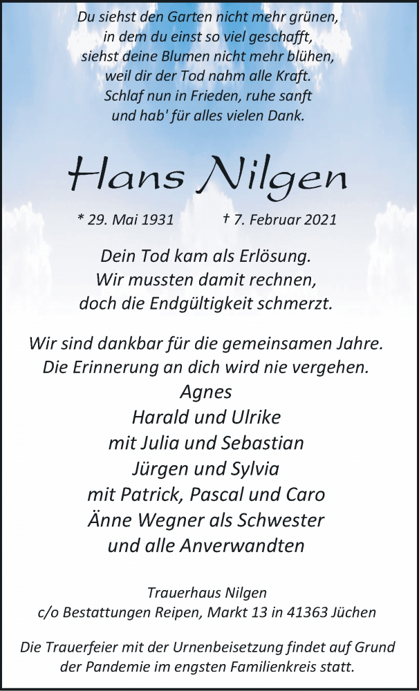 Hier finden Sie alle Traueranzeigen aus der Zeitung, die bisher für Hans Nilgen erschienen sind. Weitere Traueranzeigen, die in der Zeitung erscheinen, werden hier ebenfalls aufgelistet