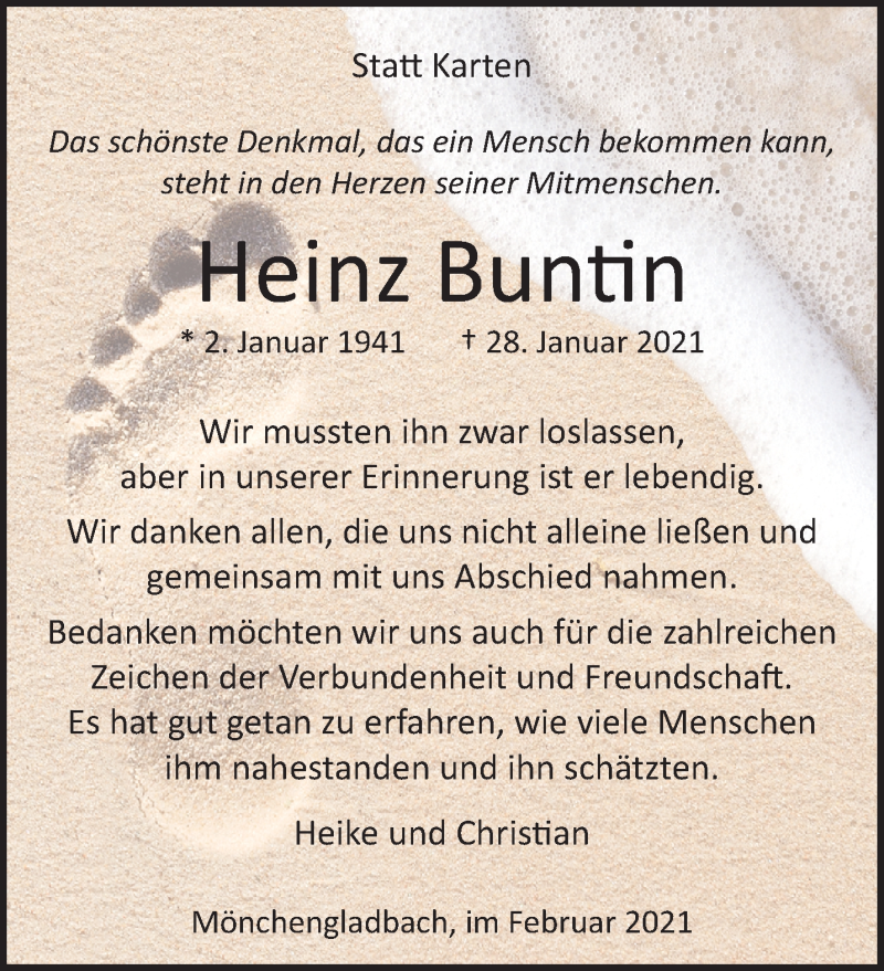 Hier finden Sie alle Traueranzeigen aus der Zeitung, die bisher für Heinz Buntin erschienen sind. Weitere Traueranzeigen, die in der Zeitung erscheinen, werden hier ebenfalls aufgelistet