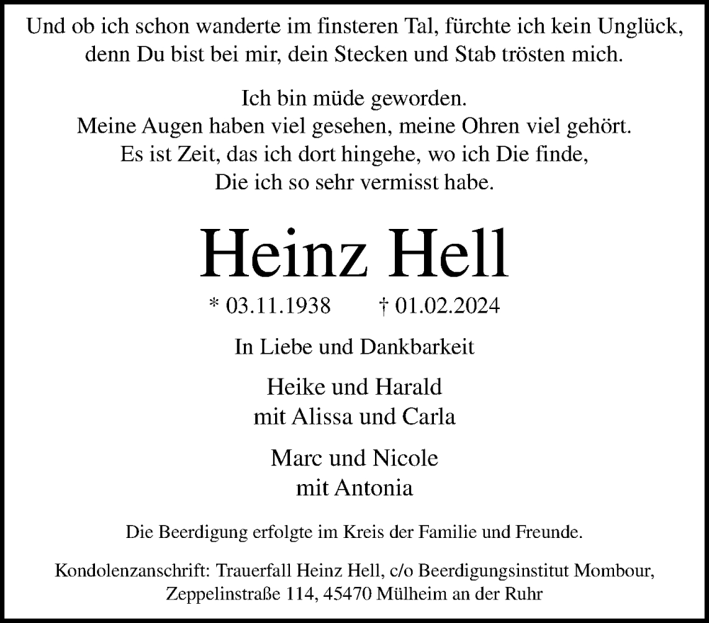 Hier finden Sie alle Traueranzeigen aus der Zeitung, die bisher für Heinz Hell erschienen sind. Weitere Traueranzeigen, die in der Zeitung erscheinen, werden hier ebenfalls aufgelistet