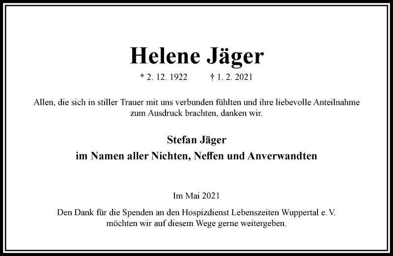 Hier finden Sie alle Traueranzeigen aus der Zeitung, die bisher für Helene Jäger erschienen sind. Weitere Traueranzeigen, die in der Zeitung erscheinen, werden hier ebenfalls aufgelistet