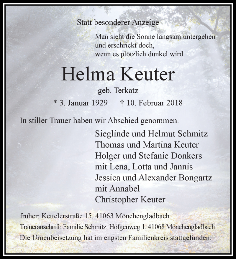 Hier finden Sie alle Traueranzeigen aus der Zeitung, die bisher für Helma Keuter erschienen sind. Weitere Traueranzeigen, die in der Zeitung erscheinen, werden hier ebenfalls aufgelistet