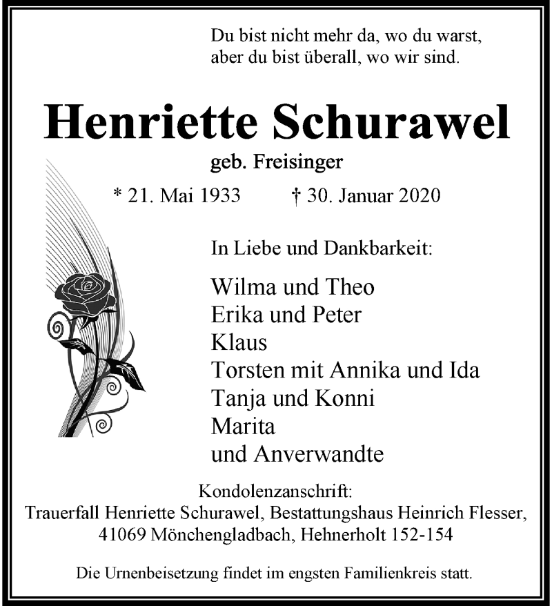Hier finden Sie alle Traueranzeigen aus der Zeitung, die bisher für Henriette Schurawel erschienen sind. Weitere Traueranzeigen, die in der Zeitung erscheinen, werden hier ebenfalls aufgelistet