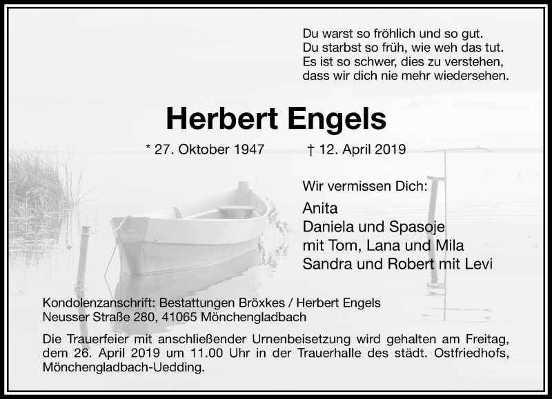 Hier finden Sie alle Traueranzeigen aus der Zeitung, die bisher für Herbert Engels erschienen sind. Weitere Traueranzeigen, die in der Zeitung erscheinen, werden hier ebenfalls aufgelistet