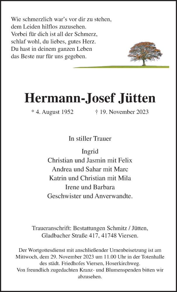 Hier finden Sie alle Traueranzeigen aus der Zeitung, die bisher für Hermann-Josef Jütten erschienen sind. Weitere Traueranzeigen, die in der Zeitung erscheinen, werden hier ebenfalls aufgelistet