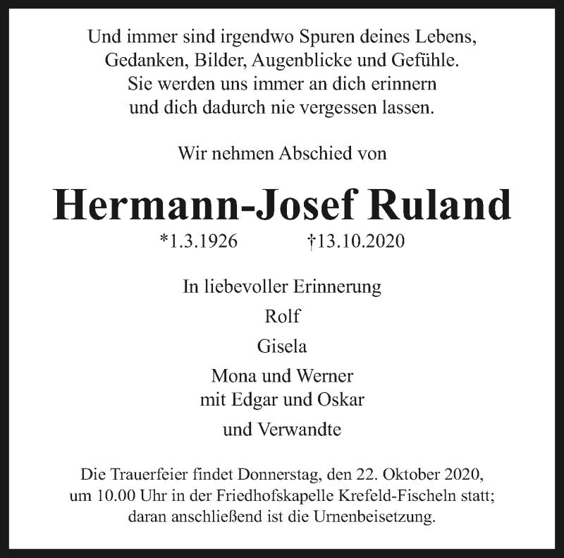 Hier finden Sie alle Traueranzeigen aus der Zeitung, die bisher für Hermann-Josef Ruland erschienen sind. Weitere Traueranzeigen, die in der Zeitung erscheinen, werden hier ebenfalls aufgelistet