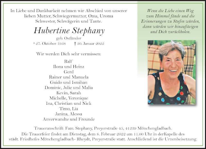 Hier finden Sie alle Traueranzeigen aus der Zeitung, die bisher für Hubertine Stephany erschienen sind. Weitere Traueranzeigen, die in der Zeitung erscheinen, werden hier ebenfalls aufgelistet