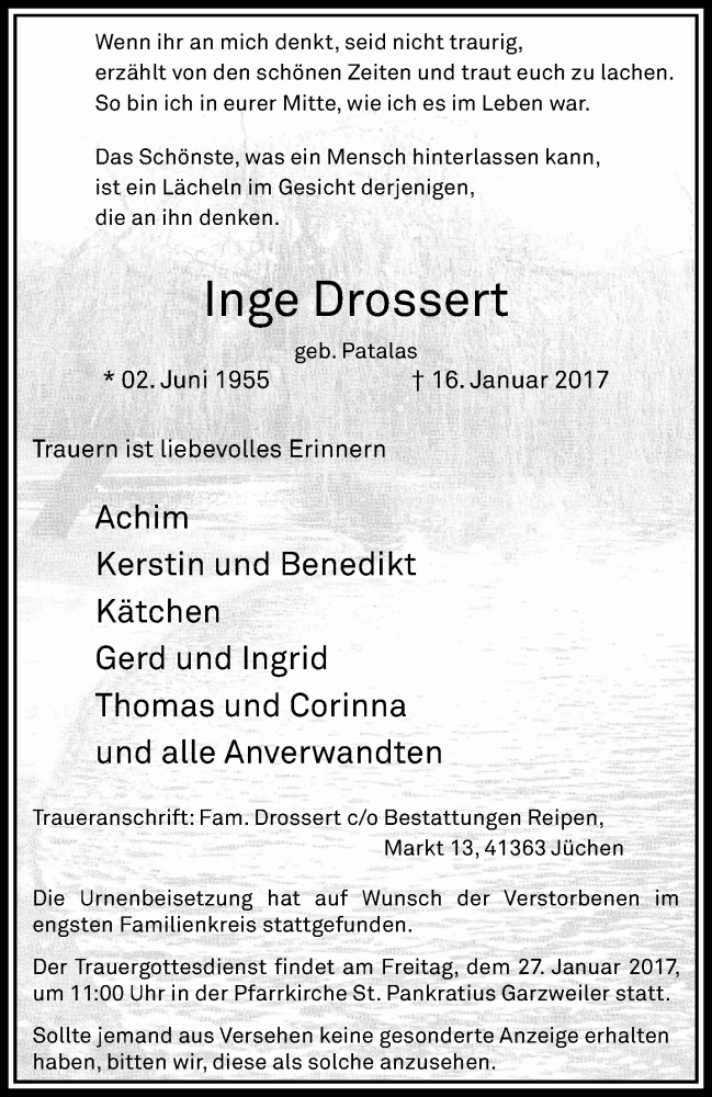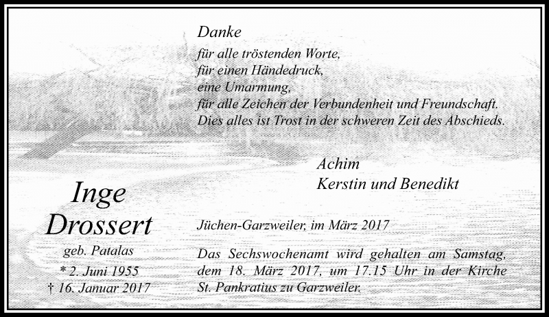 Hier finden Sie alle Traueranzeigen aus der Zeitung, die bisher für Inge Drossert erschienen sind. Weitere Traueranzeigen, die in der Zeitung erscheinen, werden hier ebenfalls aufgelistet