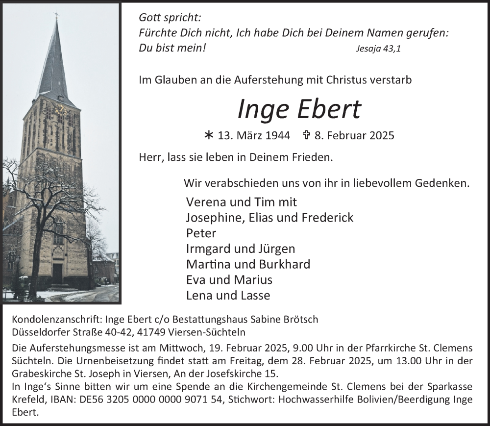 Hier finden Sie alle Traueranzeigen aus der Zeitung, die bisher für Inge Ebert erschienen sind. Weitere Traueranzeigen, die in der Zeitung erscheinen, werden hier ebenfalls aufgelistet